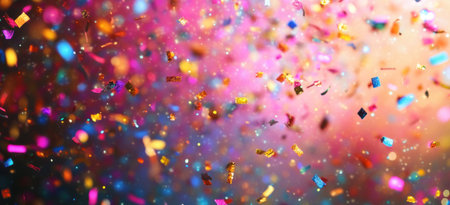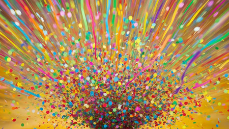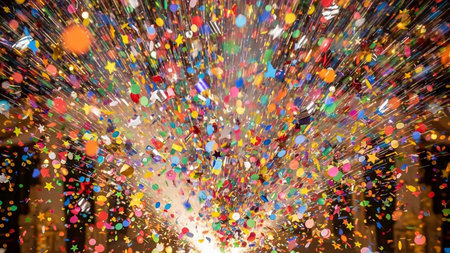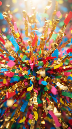 Celebration showing vibrant explosion of colorful confetti and golden streamers against a softly lit background creating a festive celebratory atmosphere keywords:...