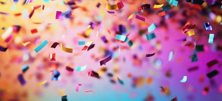 Confetti in various colors floats through the air, creating a festive atmosphere during a celebration. The lively scene radiates joy and excitement, engaging attendees.