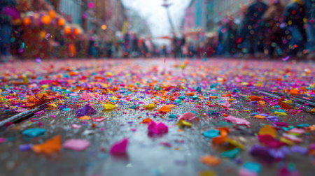 Vibrant, colorful confetti is scattered densely on a dark surface, with a shallow depth of field blurring background figures and creating a festive, dynamic atmosphere.