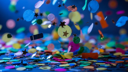 Multicolored confetti on blue backdrop. Great for holiday posters or joyful layouts, this cheerful scene inspires.