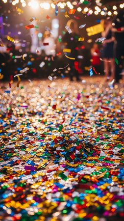 Colorful confetti falls and covers the ground in a lively celebration scene, with a shallow depth of field blurring people and lights in the background.