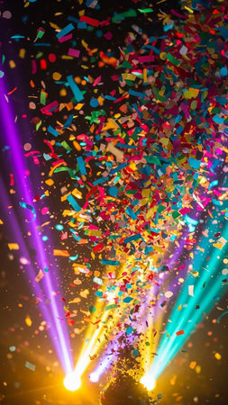 A dynamic explosion of colorful confetti and streamers illuminated by vibrant purple, yellow, and teal stage lights against a dark background.