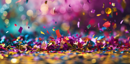 Purple showing vibrant explosion of colorful confetti and streamers falling and swirling in the air during a festive celebration with bright lights and bokeh effect...