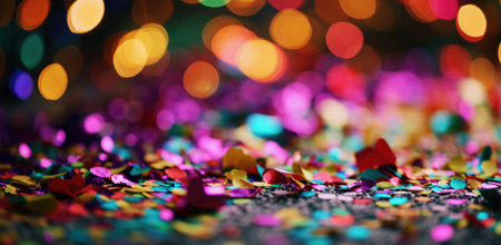 A vibrant explosion of colorful confetti and streamers against a backdrop of blurred bokeh lights, evoking a festive and joyful celebration.