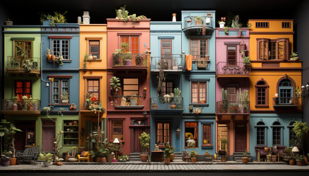 Colorful row of urban houses, illustrating vibrant city living and community life. With Generative AI technology.