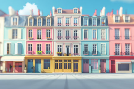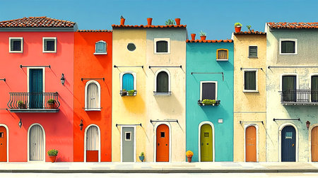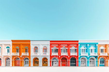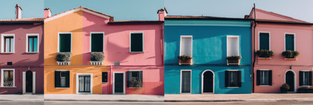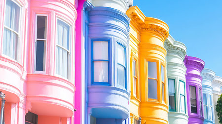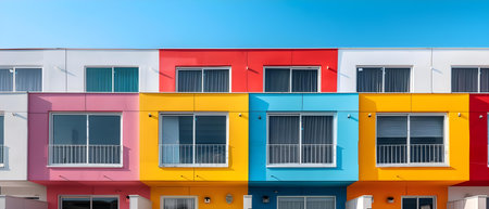 A vibrant row of colorful houses under a clear blue sky creates a picturesque urban landscape. This cheerful scene captures the essence of a lively neighborhood filled with charm and character.