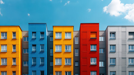 Modern and vibrant row of urban townhouses in a newly constructed real estate development. Concept Real Estate, Urban Architecture, Modern Design, Vibrant Color Palette, Townhouse Development
