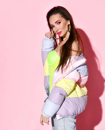 Young girl with bright face makeup on pink background. Girl dressed in a vintage sports windbreaker
