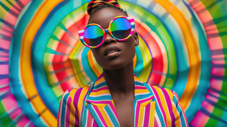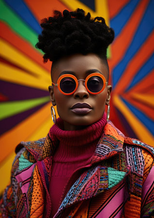 Portrait of retro black woman in sunglasses and vivid jacket with visual distortion effect on background, striking portrait with bold colors stripes and waves in pop art style, AI generated