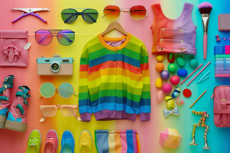 Women's clothing and accessories on a rainbow background. Top view.