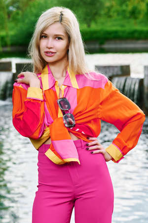 fashionable young woman in orange outfit posing in studio with colorful background