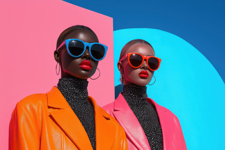 Two stylish women in colorful jackets and sunglasses posing against a vibrant pink and blue background.