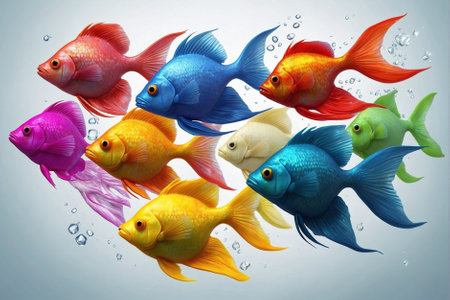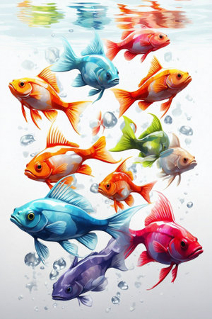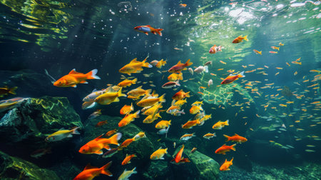 A school of colorful fish swimming gracefully in the clear waters of a river