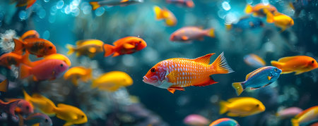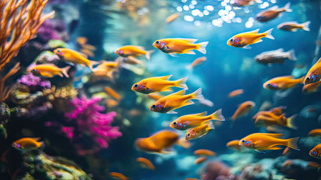 A captivating scene featuring colorful freshwater fish swimming amid vibrant coral. This underwater image highlights the beauty of aquatic life and biodiversity.
