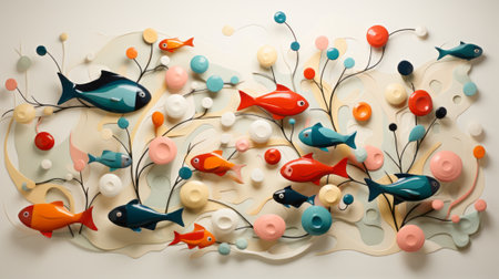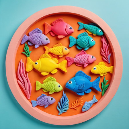 Colorful playdough scene depicting an underwater landscape with fish and seaweed. The fish are various shades of orange, purple and yellow. Aquarium or deep sea. Children picture. AI. Plasticine fish.