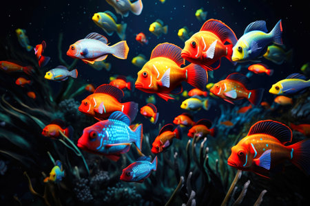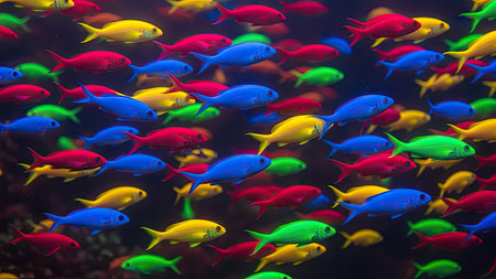 A vibrant school of fish swims gracefully in a colorfully lit aquarium, A multi-colored school of tetras spiraling in synchronized movement, AI Generated