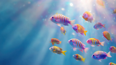 A vibrant scene capturing colorful tropical fish swimming gracefully in clear blue water, illuminated by gentle sunlight rays, creating a serene underwater atmosphere.