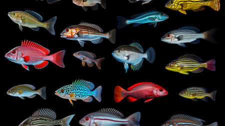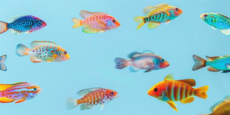 A detailed arrangement of tropical freshwater fish showcasing a range of colors and patterns. Ideal for aquarists, educational purposes, and marine life enthusiasts.