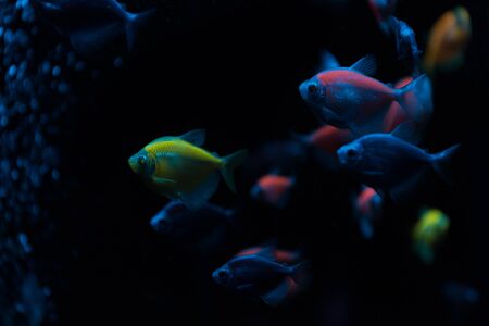 Selective focus of fishes with neon light on dark background