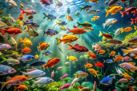 Numerous colorful aquarium fish swim through a lush underwater ecosystem filled with plants and creatures, creating an enchanting environment.