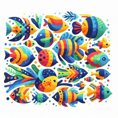 A lively arrangement of various colorful tropical fish swimming together, featuring hues of pink, blue, yellow, and purple set against a clean white background.