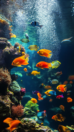 Vibrant Underwater Scene Featuring Colorful Tropical Fish in a Lively Coral Reef Environment for Nature and Aquatic Themes Exploration