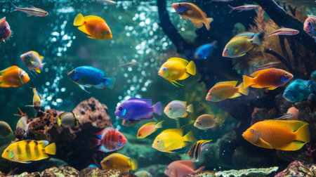 Colorful tropical fish swimming in an aquarium, showcasing vibrant marine life and underwater beauty in a diverse aquatic environment.