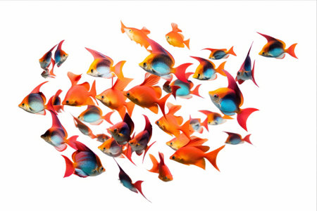 A variety of colorful goldfish swimming on white background AI generated