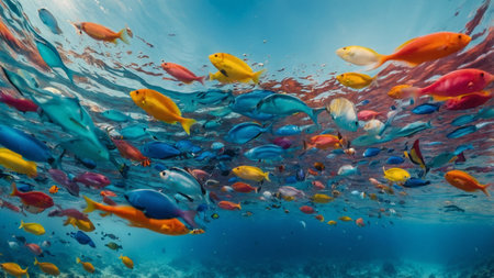 Vibrant underwater scene with colorful fish swimming around a coral reef, illuminated by natural sunlight