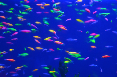Many small fishes in aquarium. Abstract photo of underwater life.