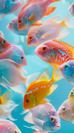 School of vibrant pink fish swimming in clear blue waters. concept of marine life, underwater harmony, aquatic beauty. Vertical. Background.