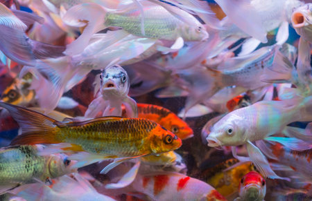 Colorful fishes swimming in a fish tank in a fish farm.