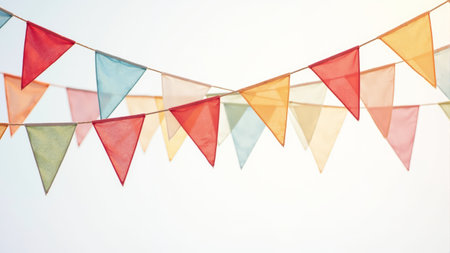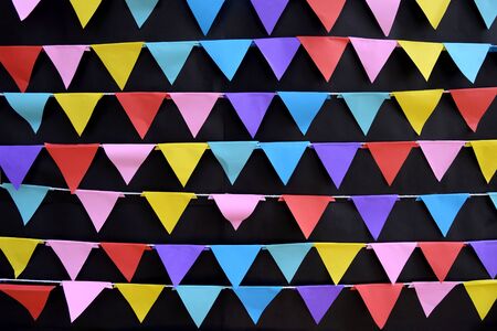 This image features a charming arrangement of colorful triangular flags hanging on a string against a dark wall. Ideal for conveying festive themes.