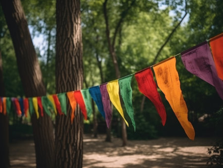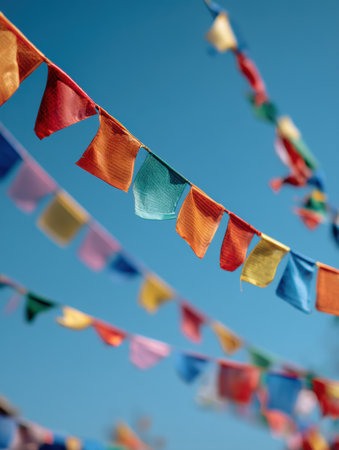 Vibrant flags in shades of red, orange, and blue flutter gently against a clear sky, creating an inviting atmosphere. The festive display brings a sense of joy and celebration to the surroundings.
