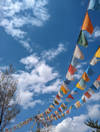 Vibrant Vesak flags dance in the breeze under a vast blue sky, creating a festive atmosphere for the celebration of Buddhas birthday.