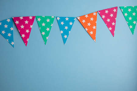 A garland of multicolored flags on a blue background with space for your text.Holiday Template