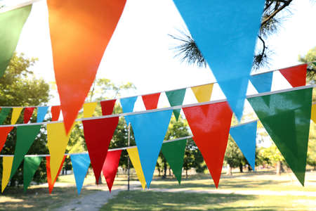 Colorful paper bunting party flags isolated on white background . Carnival garland with flags. Decorative colorful party pennants for birthday celebration, festival and fair decoration. Holiday
