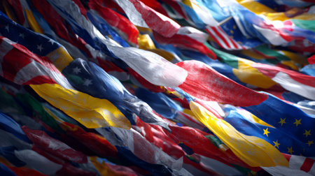 Numerous national flags from various countries are hanging together, creating a vibrant display of international cooperation and global community