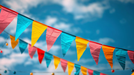 Colorful triangular flags flutter in the wind, adding a celebratory air to an outdoor event under the bright blue sky, enhancing the festive atmosphere.