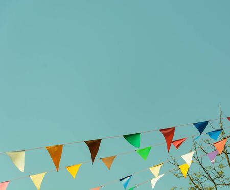 colorful festive bunting flags against a blue sky background in retro and vintage tone