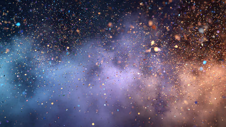 This vibrant and colorful abstract background features glittering particles in shades of orange, purple, and blue, perfect for creative projects.