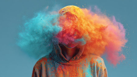 Colorful powder explosion creates a vibrant art piece on a person wearing a hoodie in a studio setting