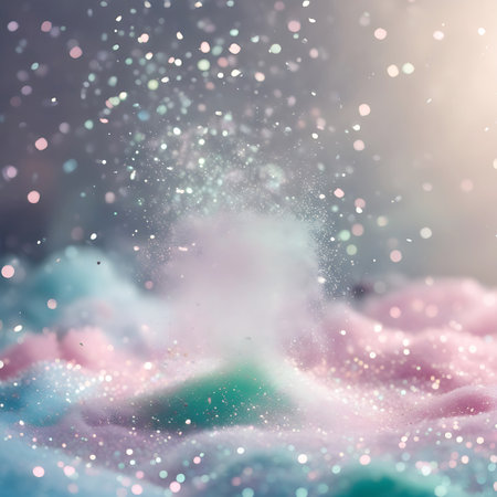 This image showcases vibrant dust particles suspended in the air, creating a mesmerizing effect against a soft blend of pink and blue tones, evoking an abstract atmosphere.