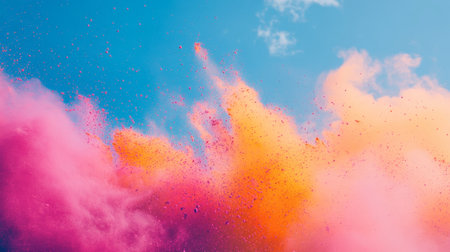 A vibrant explosion of pink and orange dust creates a stunning visual contrast against a bright blue sky, evoking feelings of joy and celebration.