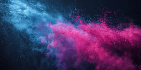 Colorful clouds of pink and blue powder burst into the air against a dark background, creating a stunning visual effect during a celebration or artistic event.