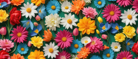 Beautiful and diverse assortment of vibrant multicolored blooms in a botanical garden, creating a stunning natural mosaic pattern, perfect for summer and spring celebrations