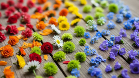 A spectrum of small flowers and petals is arranged by color on weathered wooden planks, creating a vibrant display.