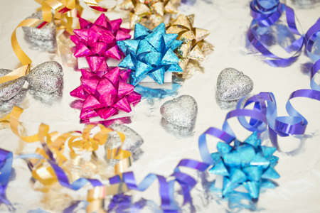 Birthday party decoration background. Colourful backdrop. Festive event. Celebration decor. Bright ribbons on surface
