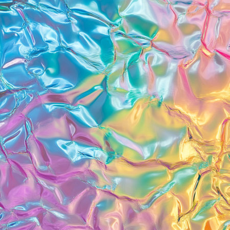 High-resolution abstract background featuring a holographic rainbow foil texture with iridescent effects. This colorful and reflective design offers a shiny, dreamy look perfect for modern digital art, trendy web design, packaging, or creative print materials. The surface glows with shifting pastel and neon tones, creating a futuristic and magical atmosphere. Ideal for projects needing a vibrant, luxe, and visually engaging backdrop. AI-generated seamless pattern