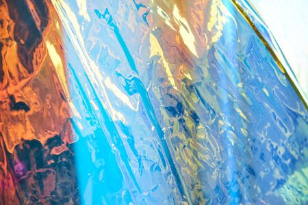 Abstract fashion rainbow holographic background in the style of the 80s. The texture of the foil with scratches and irregularities. Crumpled iridescent foil of real texture. High quality photo